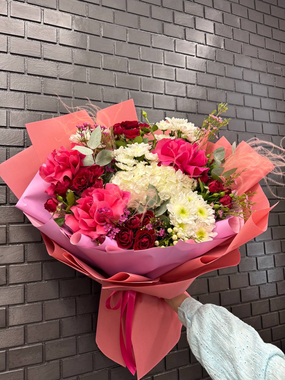 Это гармоничное сочетание нежности и страсти, воплощённое в ярких цветах. Гортензия добавляет букету лёгкости и романтичности, а красная роза символизирует любовь и страсть.