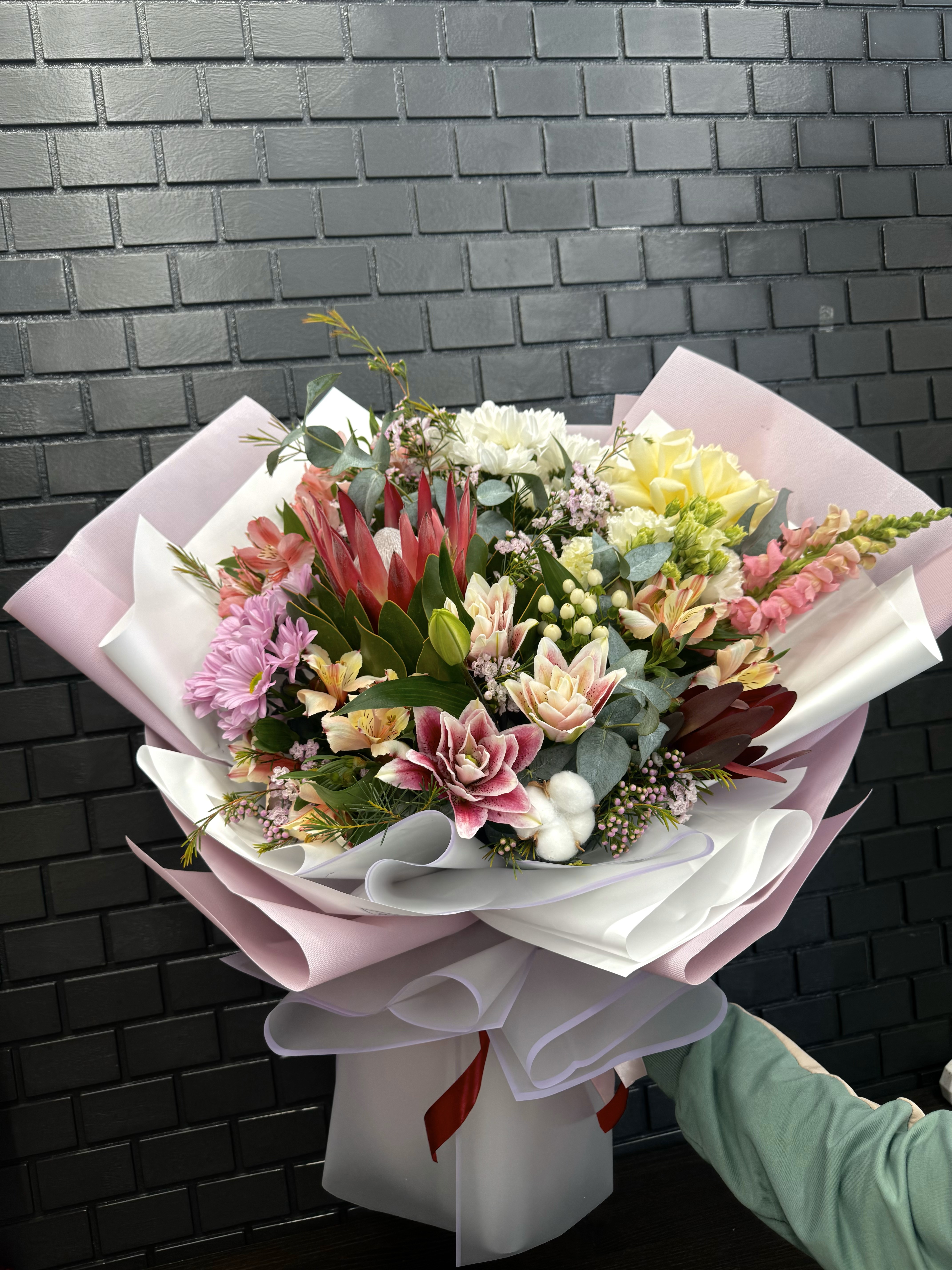 Букет из протеи и пионовидной лилии может быть описан как воплощение вкуса и изящества. Он подойдёт для любого случая, будь то свадьба, юбилей или просто подарок любимому человеку.