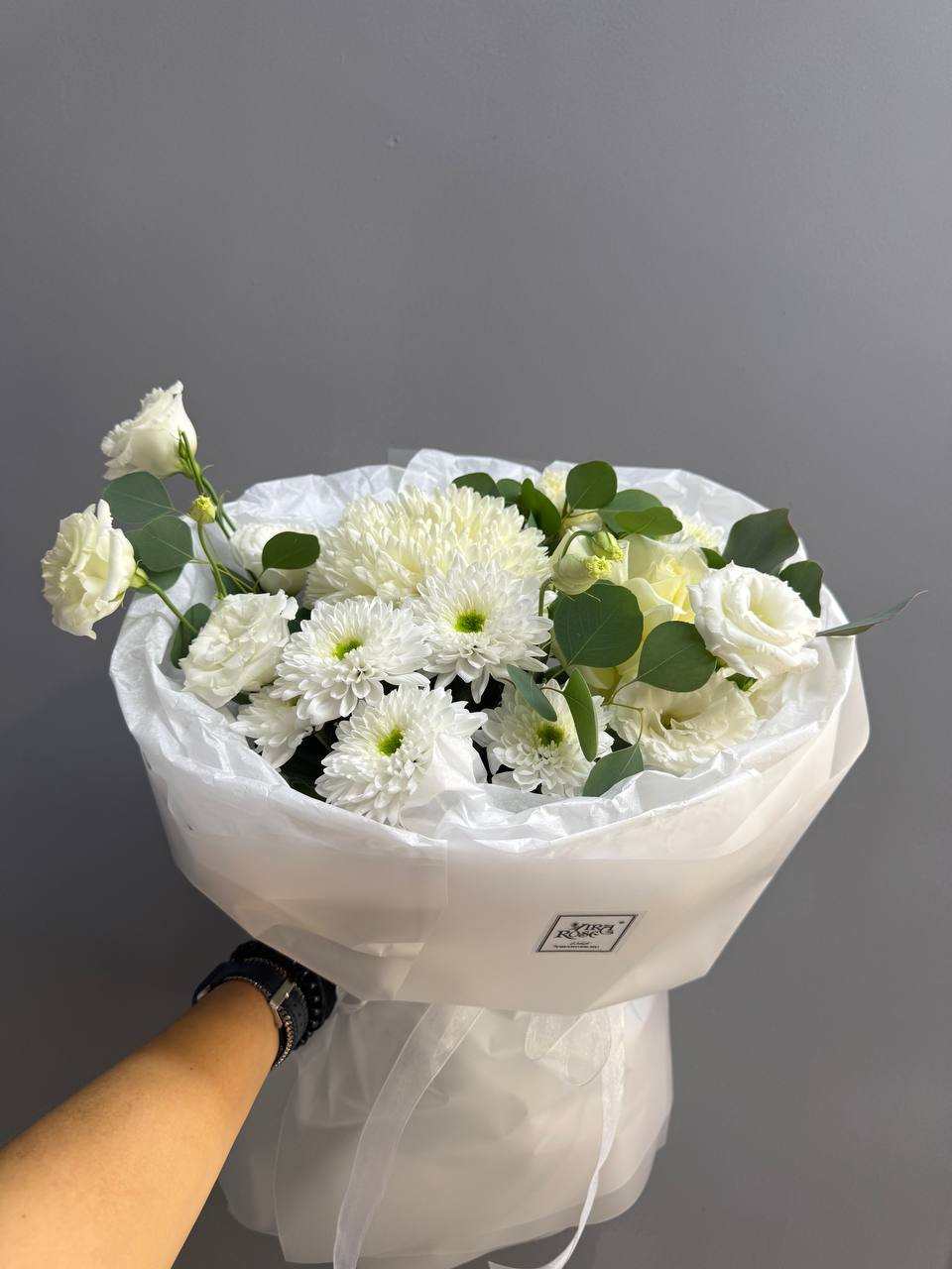 Нежная элегантность этого букета покоряет с первого взгляда. Словно сотканный из лунного света, он излучает неповторимое очарование и умиротворение.