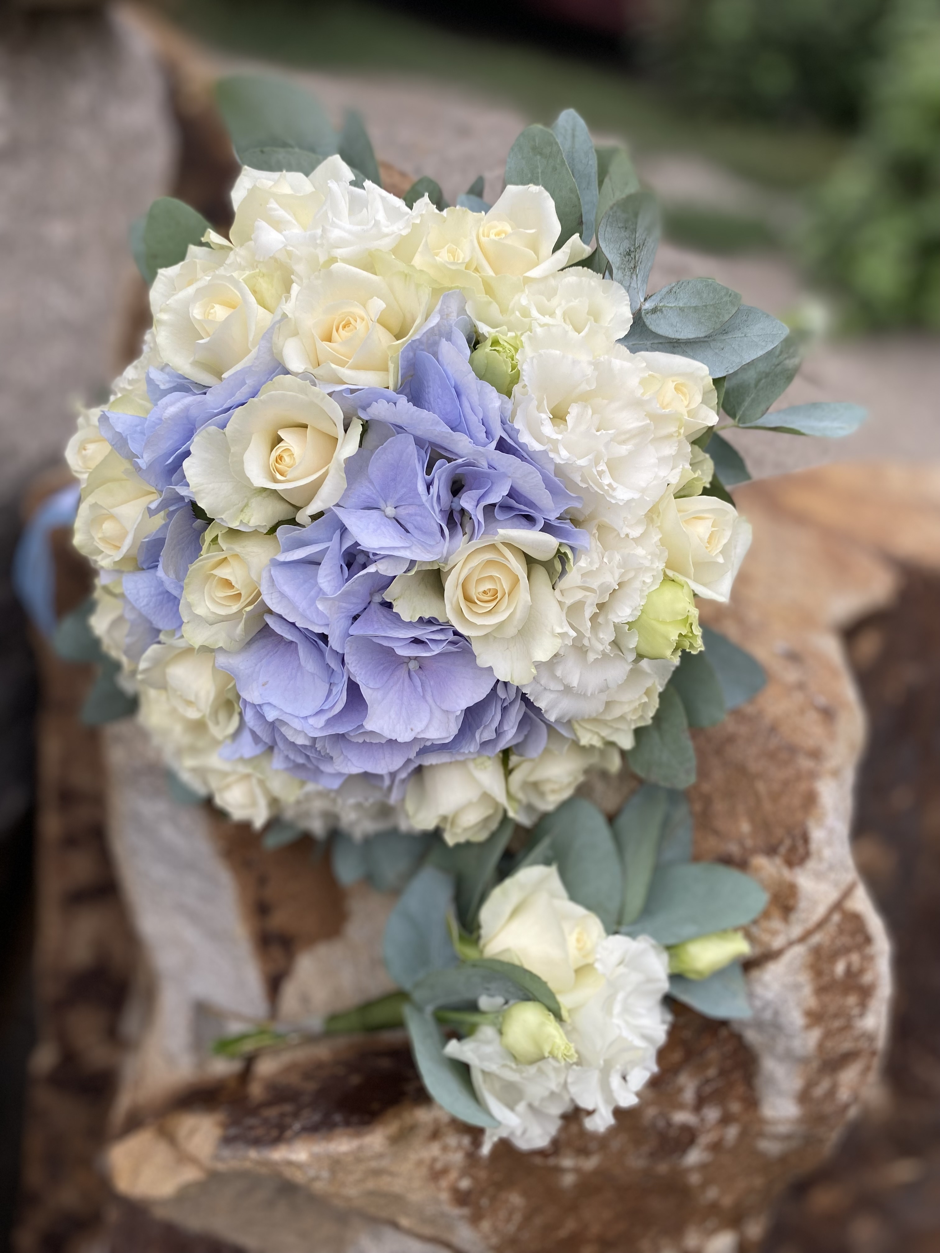 Свадебный букет из роз и голубой гортензии — это изысканное сочетание нежности и роскоши. Розы символизируют любовь и страсть, а голубая гортензия добавляет букету свежести и загадочности. Этот букет станет прекрасным дополнением к образу невесты и создаст атмосферу волшебства на свадьбе.